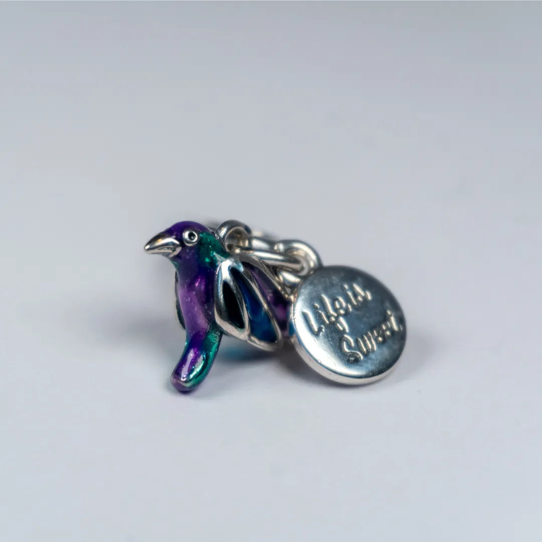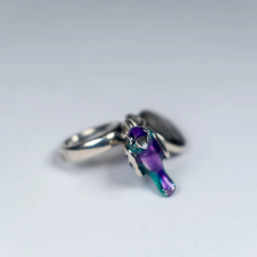 Krila kolibrića ukrašena su prozirnim emajlom, dok tijelo krasi prelijevajući zeleni emajl koji savršeno dočarava njegovu lakoću i gracioznost u letu.