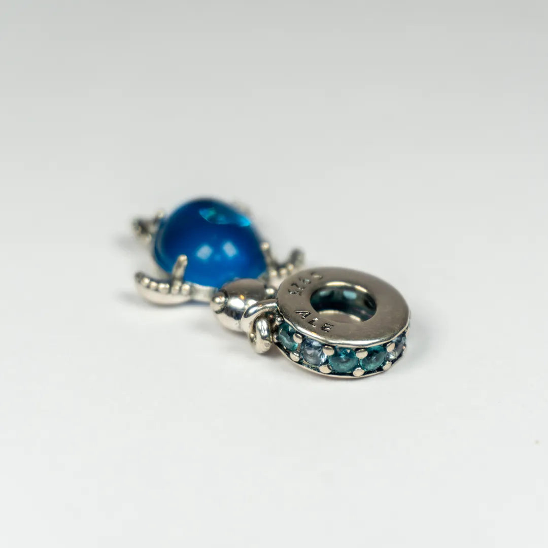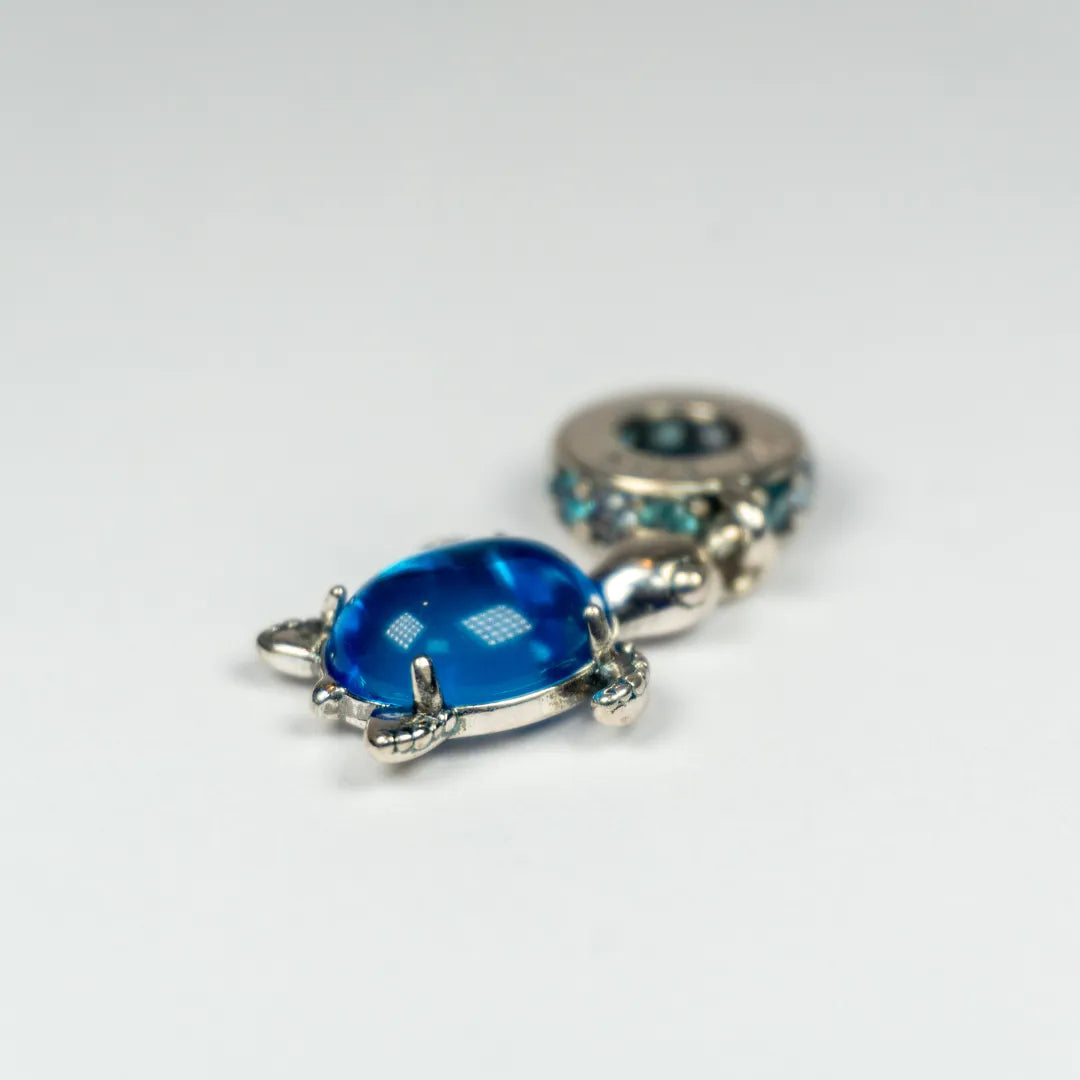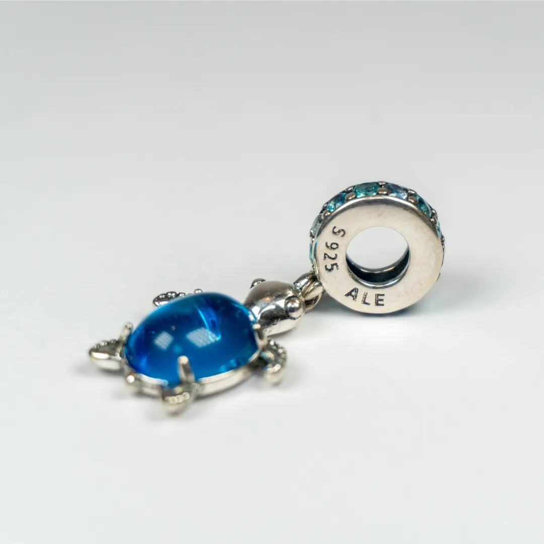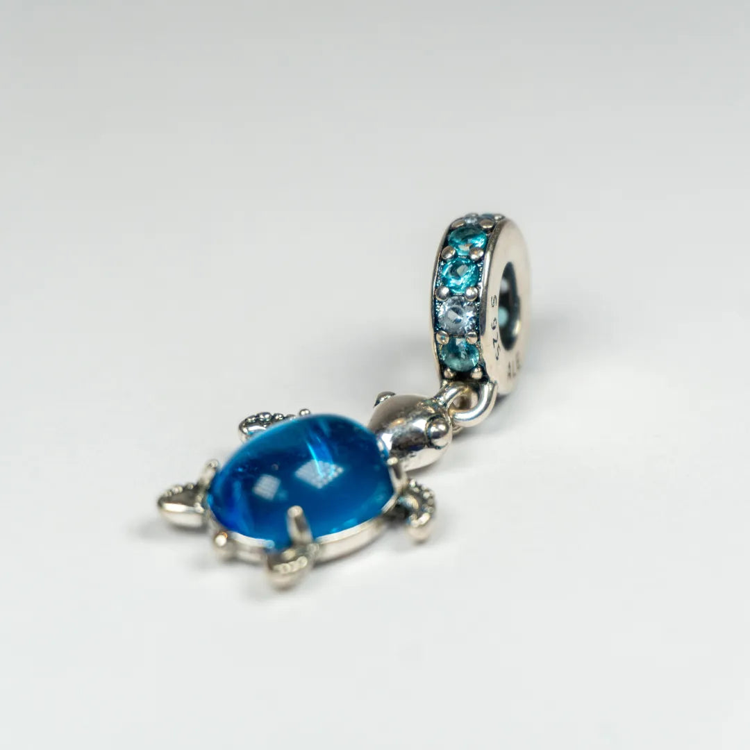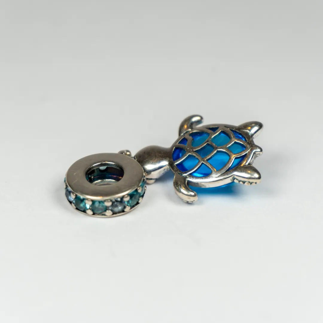 ✨ Predstavljamo Pandora viseći privjesak Morska Kornjača s Murano staklom – čaroban komad nakita inspiriran mirnim bićima dubokog plavog mora. Privjesak je ukrašen nježnim aqua plavim i ledeno zelenim kristalima te posebnim Murano staklom u boji paunovog perja koje stvara predivan efekt igre svjetla.