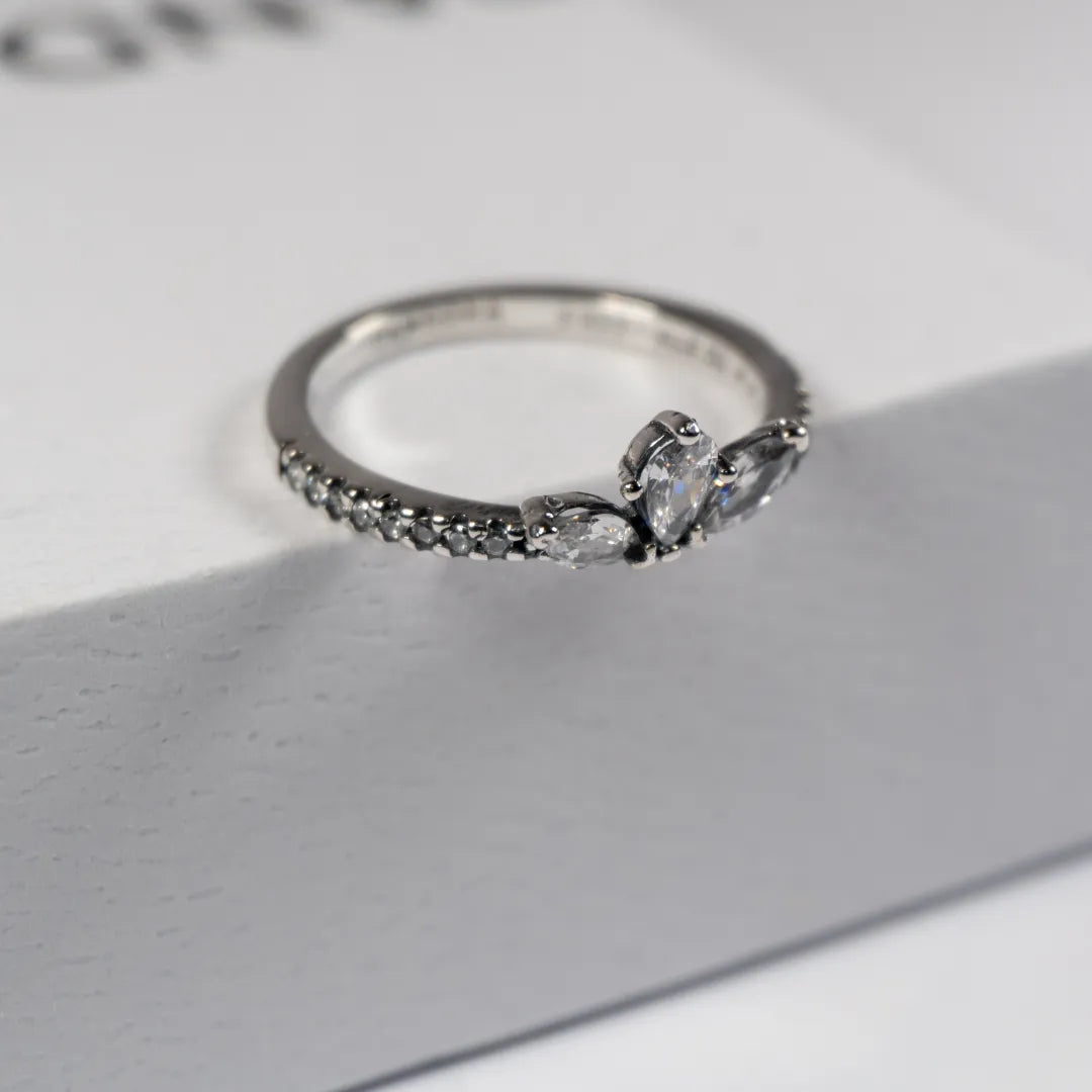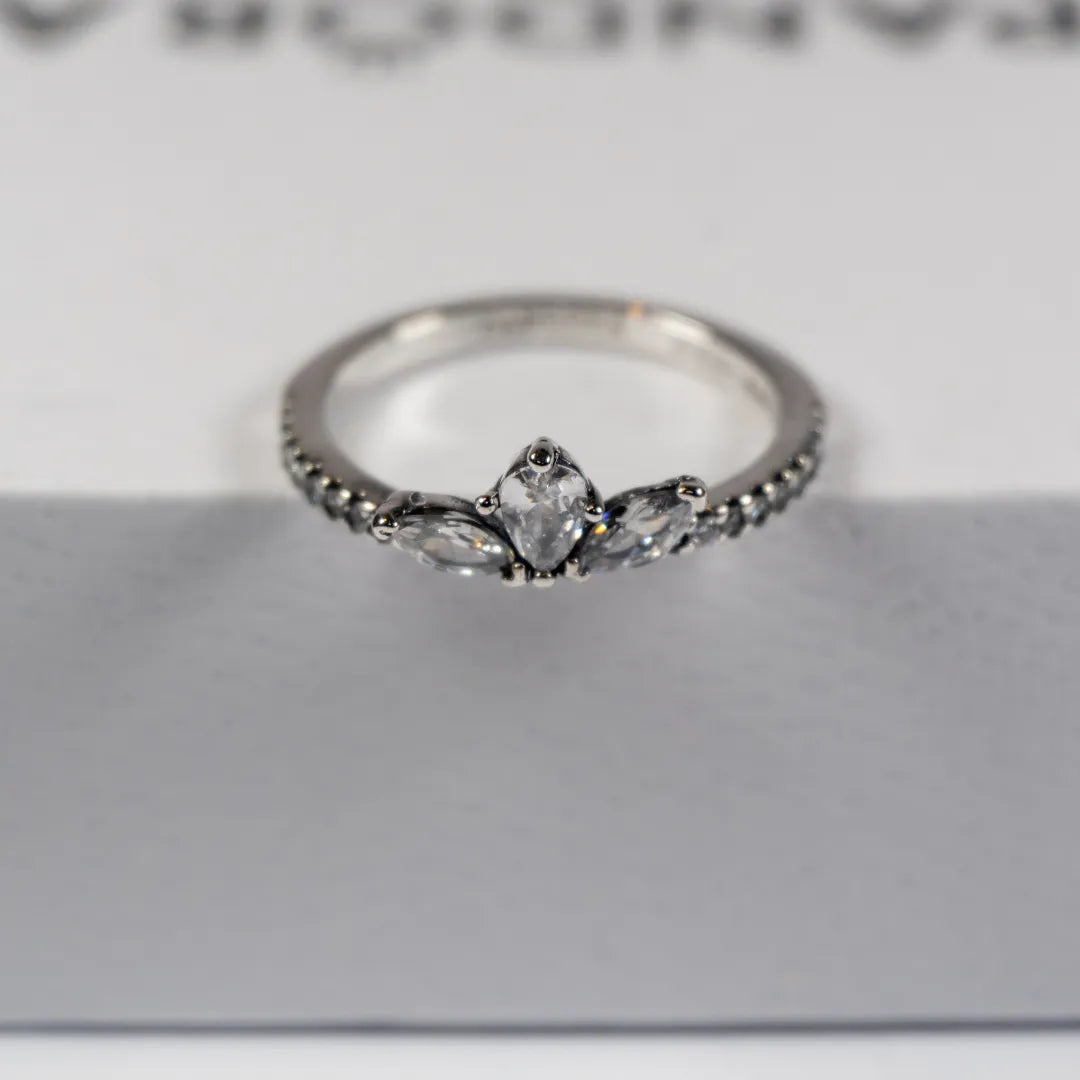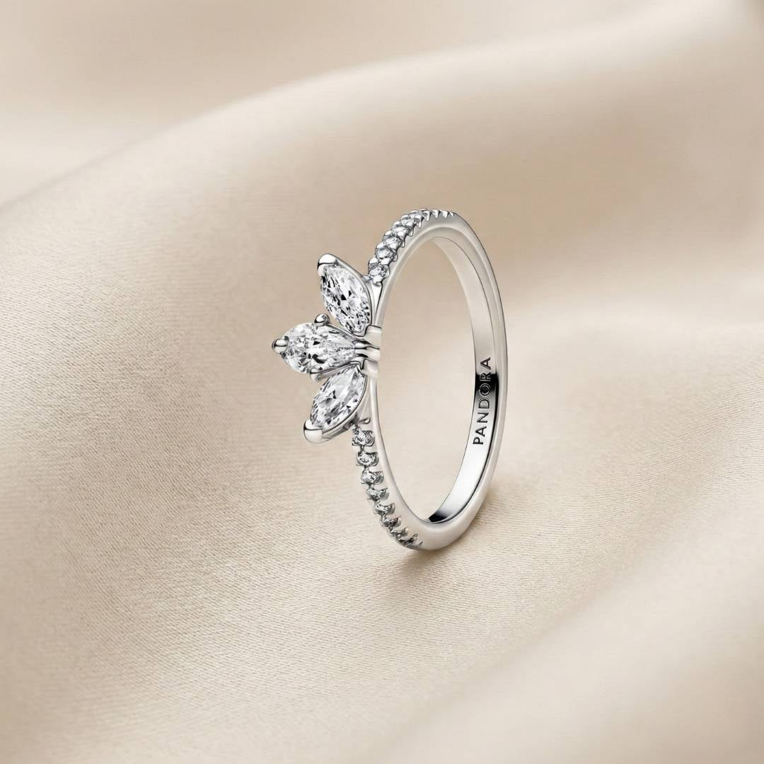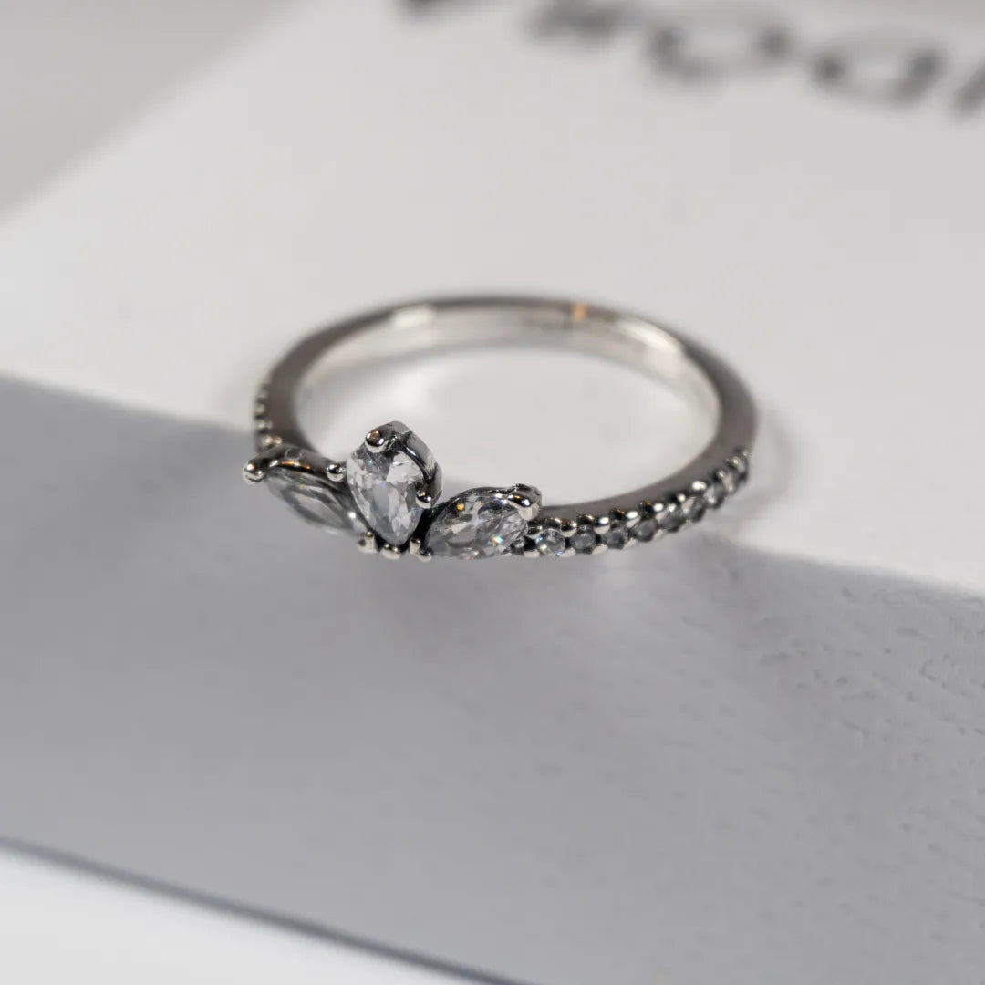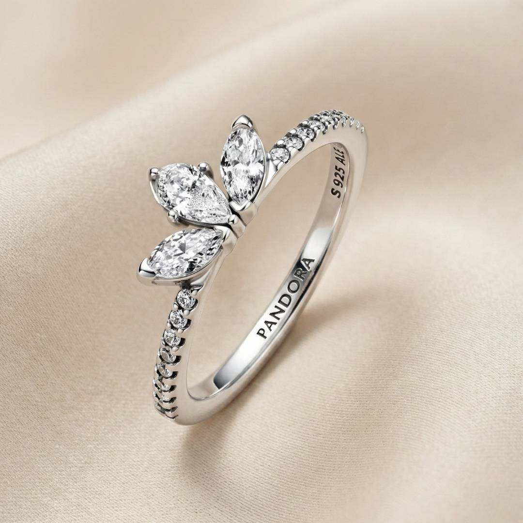 ✨ Predstavljamo Pandora Timeless svjetlucavi prsten Herbarij – elegantan i profinjen komad nakita nadahnut bezvremenskom ljepotom prirode. Prsten krase tri središnja kamena u obliku latica: dva u markiz (ovalnom) rezu i jedan u kruškolikom obliku, pažljivo postavljena kako bi zajedno tvorila nježan motiv cvjetnog grozda.